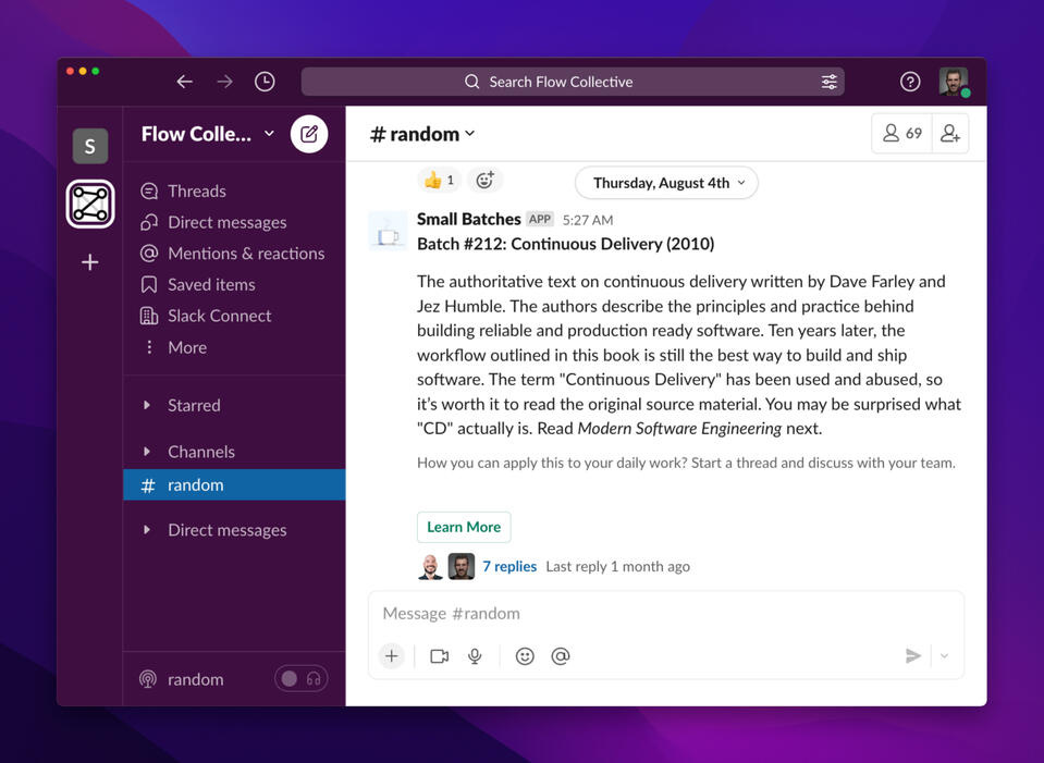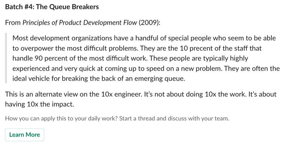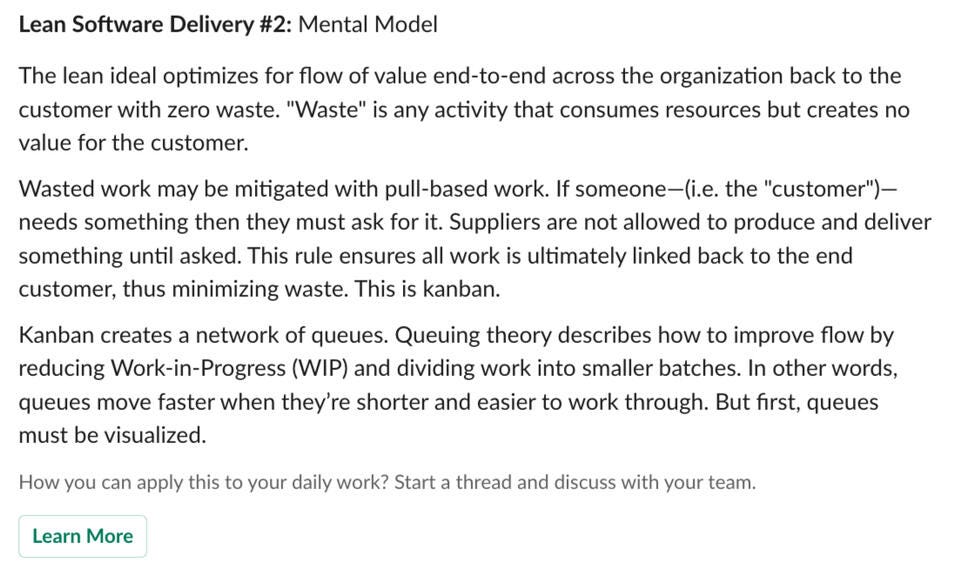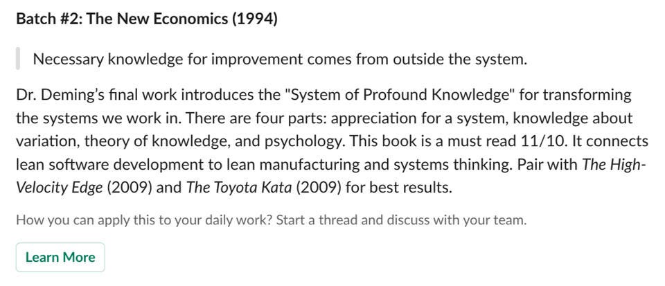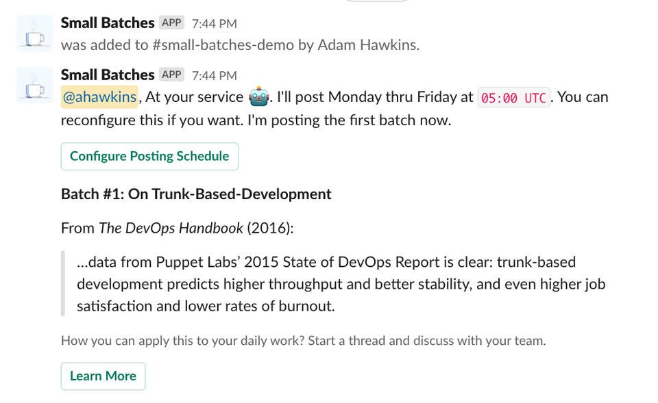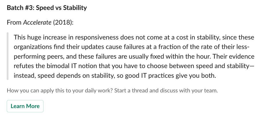 Small Batches introduces new topics and connects the dots between what the team already knows. Posting to Slack turns the team’s gathering place into a space for continuous learning and improvement.
