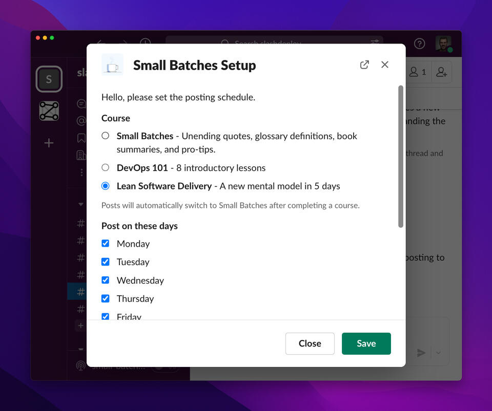 The Small Batches slack app is a perk for Software Kaizen subscribers. Subscribe to get your install link.
