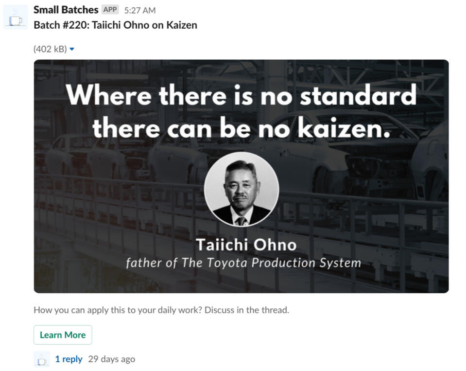 Install the Small Batches Slack app, then invite the app your team's channel. The app immediately begins posting curated material to share knowledge and build capabilities. Incremental daily kaizen.